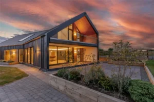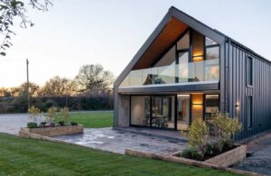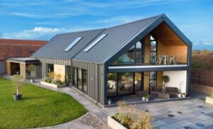 Der Bauherr entschied sich für die derzeit am meisten gewünschte Lösung für ländliche Wohnhäuser, bei der die Dachhaut nahtlos in die Fassade übergeht und ein kompaktes Ganzes bildet.