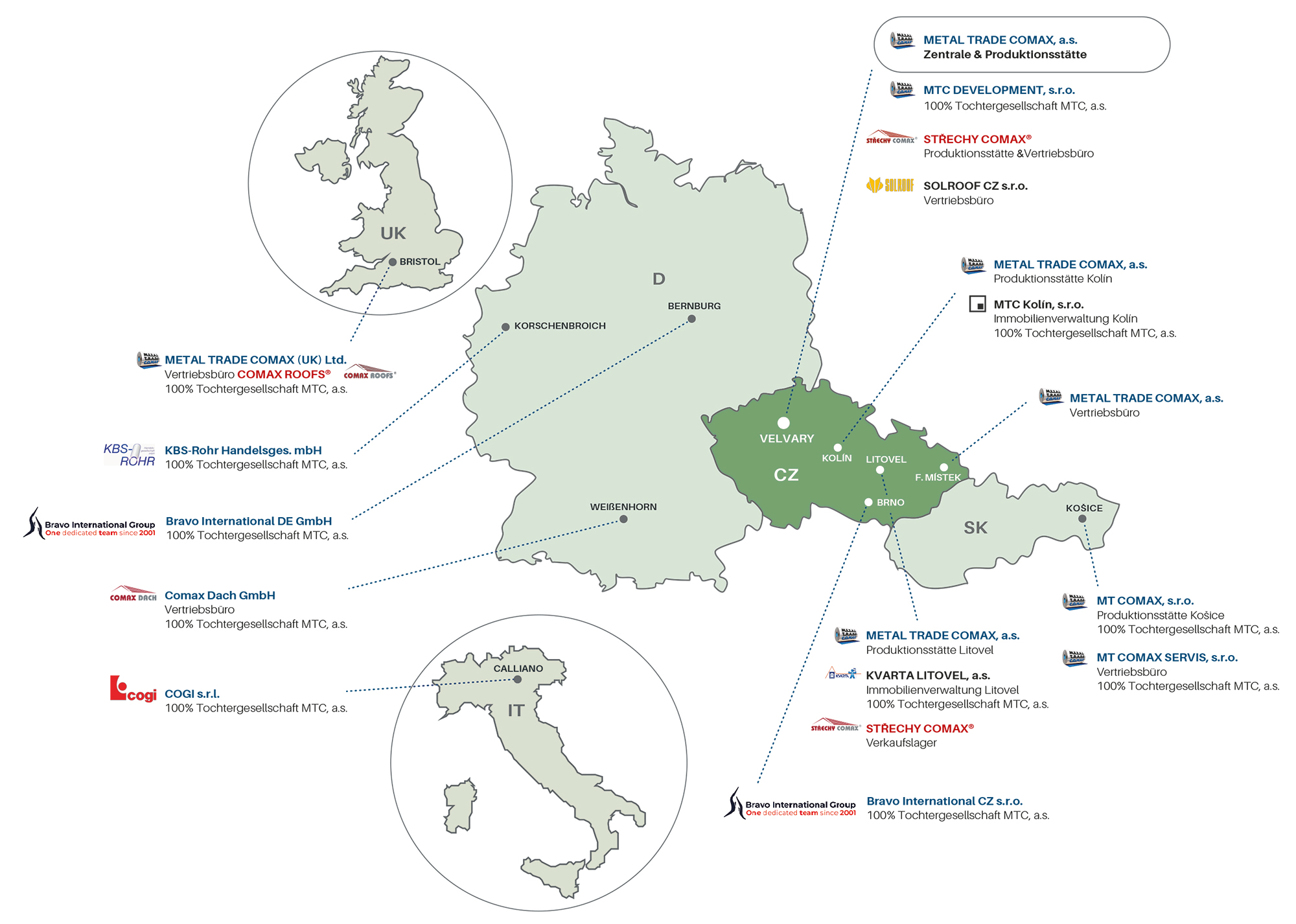 Unser jüngster Betrieb ist COMAX® DÄCHER, der 2015 unter diesem Handelsnamen eröffnet und 2016 um eine Handelsvertretung in England erweitert wurde. Die Produktion von COMAX-Metalldacheindeckungen ist jedoch die Anbindung an unsere ALUKRYT®-Ziegel, eine der ältesten und bekanntesten Dachmarken, die seit 1973 in der Tschechoslowakei hergestellt werden.