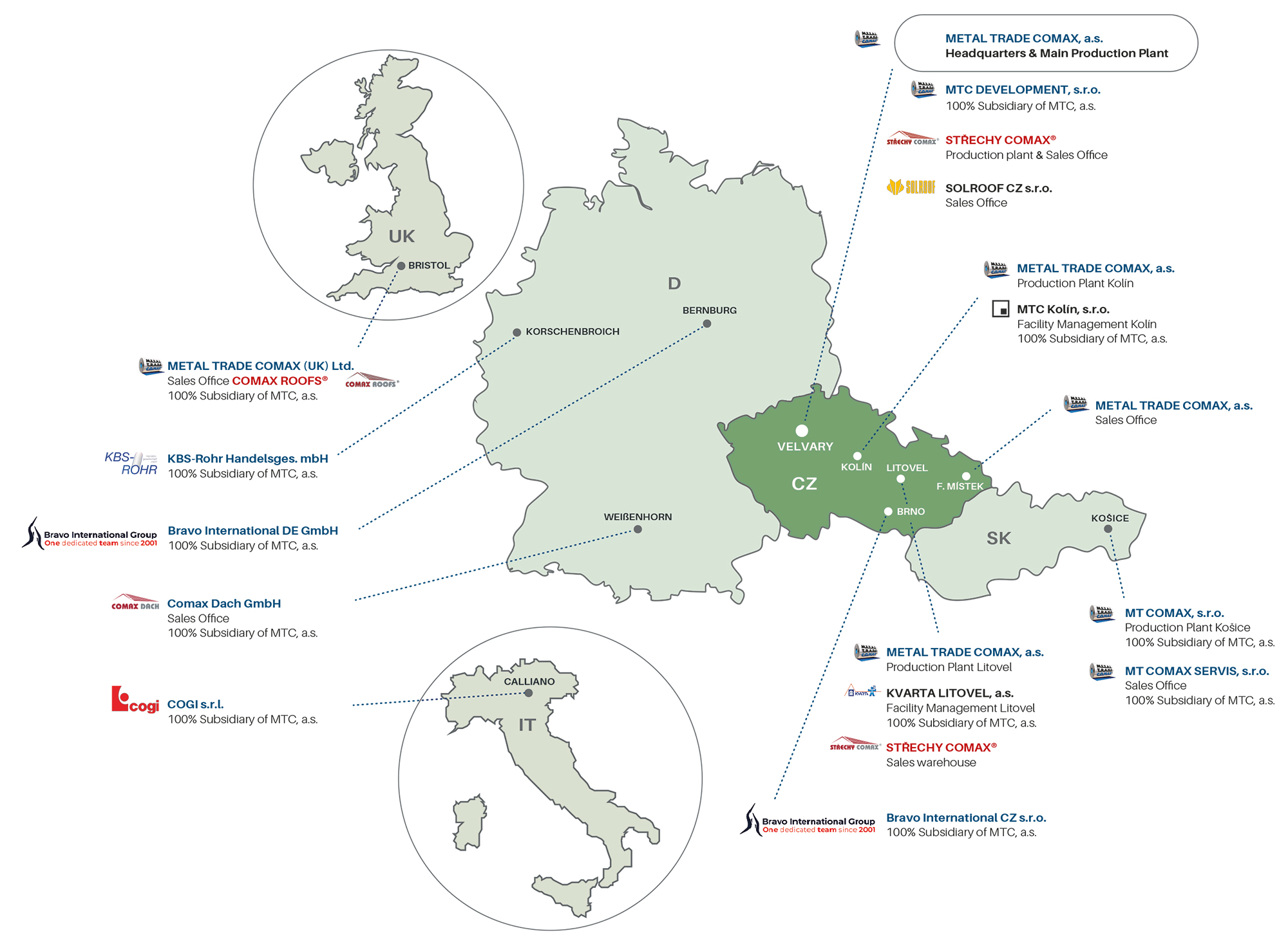 In the spring of 2024, together with professionals from the field of solar solutions, we founded a joint venture SOLROOF CZ, which brings an innovative solar system fully integrated into steel roofing to the Czech market. We founded a subsidiary MT COMAX SERVIS in Košice, Slovakia, to expand our activities in the sale of hot and cold rolled products, and registered Comax Dach GmbH in Germany, to present our modern aluminum roof and facade coverings in Germany.