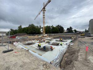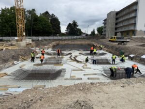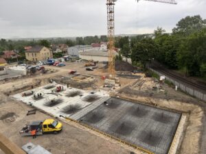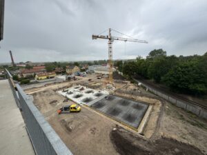 We bring you a view of the nascent foundations of the 2nd apartment building of the BYTY COMAX project in Velvarie, which will be completed in September 2026. We took a high-rise view of the construction from the eastern terrace of the building of Phase I, which will soon open to view the standards of a model family apartment 3 + kk (86m) and will be handed over to the owners in the autumn of 2025.