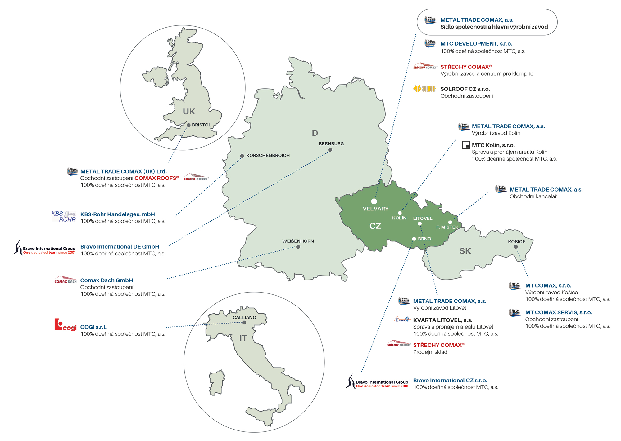Na jaře 2024 jsme s partnery z oboru solárních řešení založili joint venture SOLROOF CZ, který na český trh přinesl solární systém plně integrovaný v ocelové střešní krytině. V Košicích jsme založili dceřinou společnost MT COMAX SERVIS s cílem rozšířit naše aktivity při prodeji za tepla a za studena válcovaných výrobků a v Německu jsme téhož roku registrovali firmu Comax Dach GmbH pro prodej našich hliníkových střešních a fasádních výrobků.